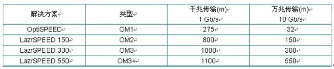 美國康普公司的多模光纜分為多模OptiSPEED®解決方案(62.5/125μm)和萬兆多模LazrSPEED® 解決方案(激光優化萬兆50/125μm)。LazrSPEED分成三個系列,即LazrSPEED 150、300、550系列,且LazrSPEED萬兆多模光纜均通過UL DMD認證。具體傳輸指標請看下表: