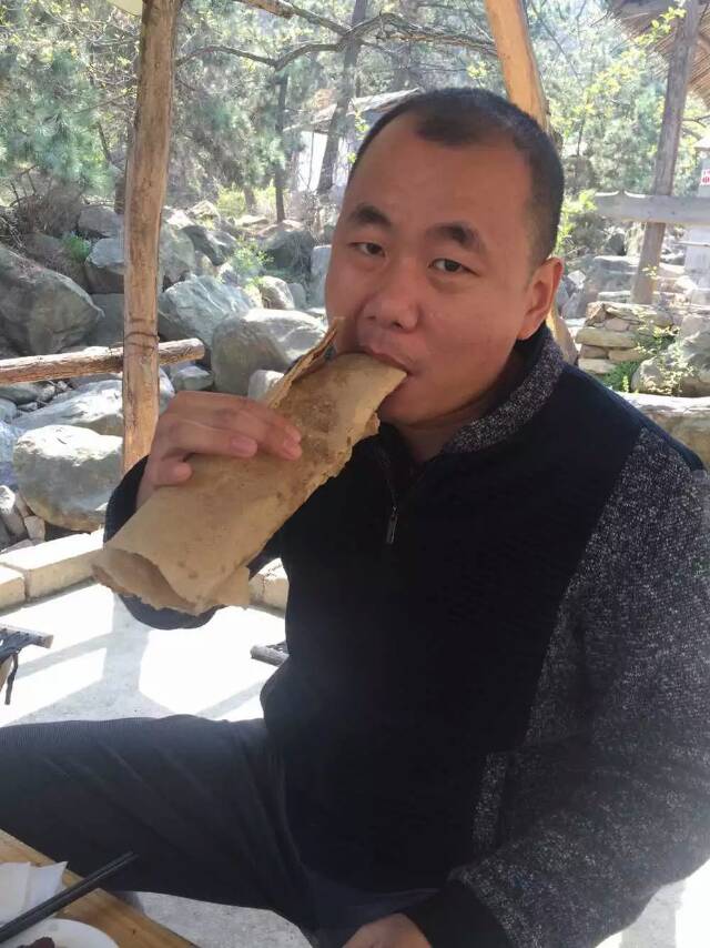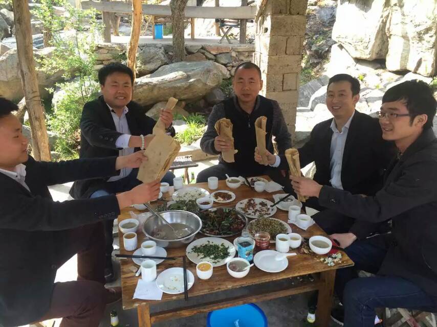 圖為金鱗羽凡總與客戶在山東沂蒙山品嘗地瓜面煎餅。