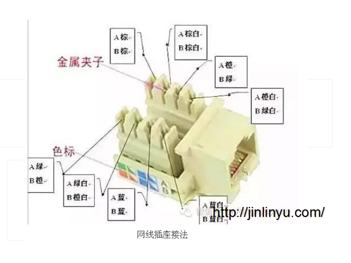 網線插座就是把網線和信息模塊正確的連接起來,使得網絡能通,現在家庭中大多使用雙絞線(即一般的網線),一般分為T568A和T568B兩種線序,信息模塊端接入方式分T568A模塊和T568B模塊兩種方式,兩種端接方式所對應的接線順序如下: